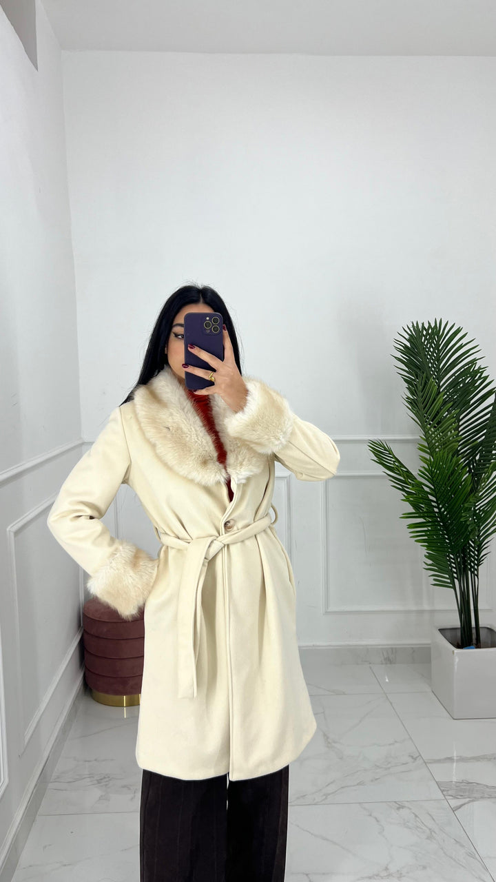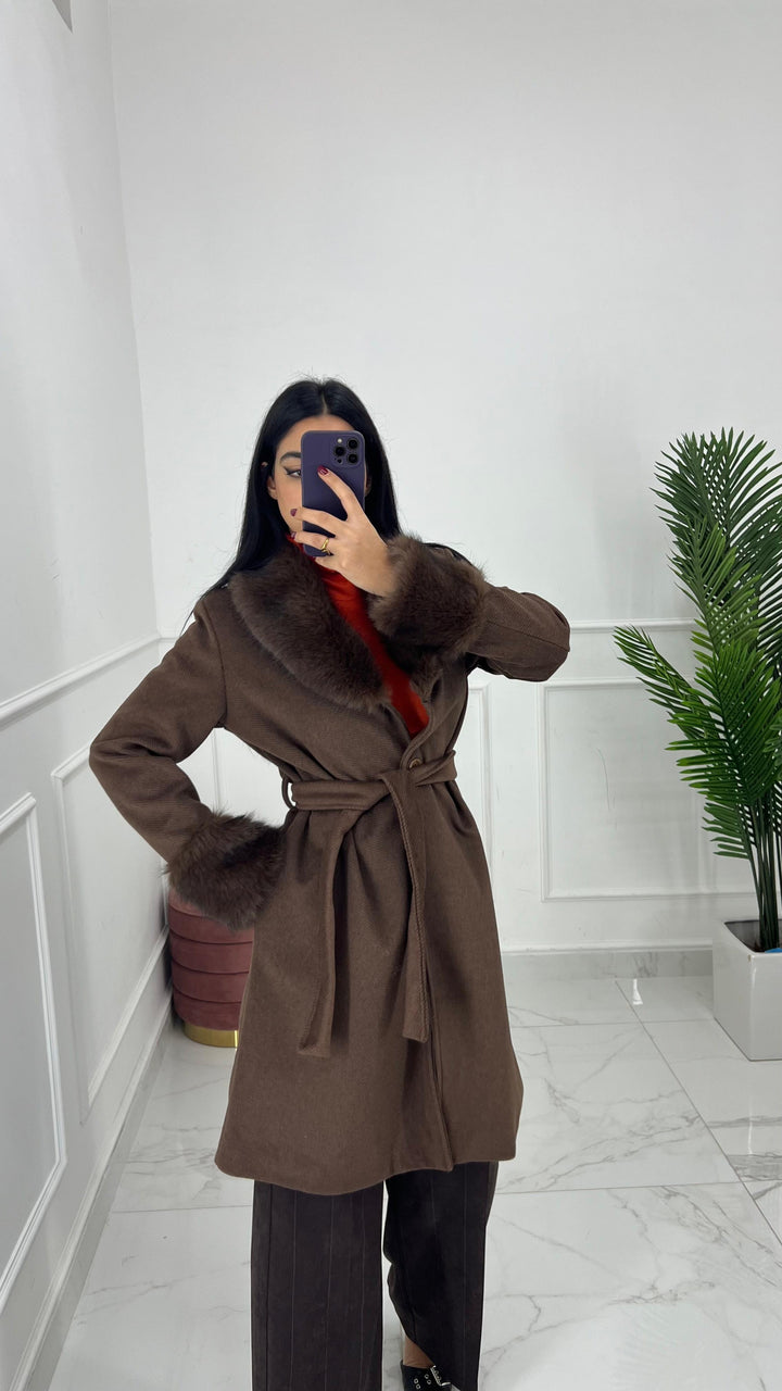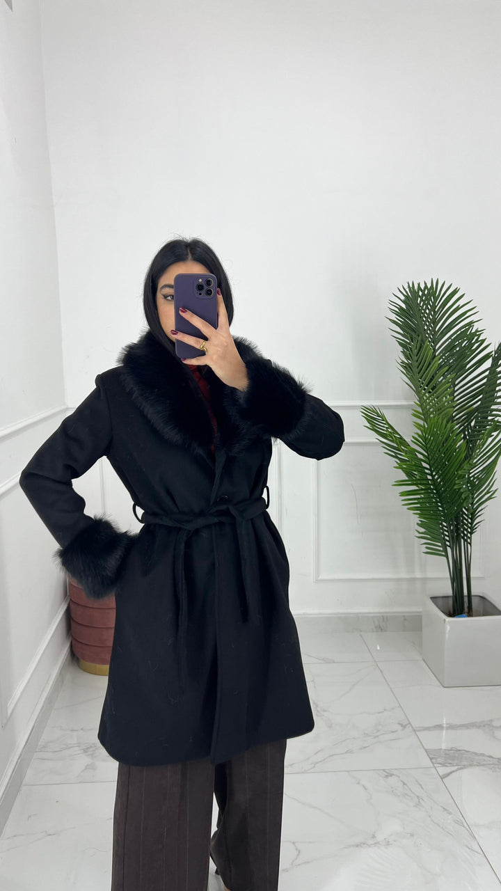 CAPPOTTO DOPPIO PETTO CON CINTA REMOVIBILE E PELLICCIOTTO SULLA MANICA E SUL CAPPUCCIO