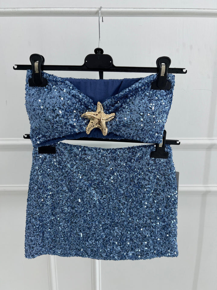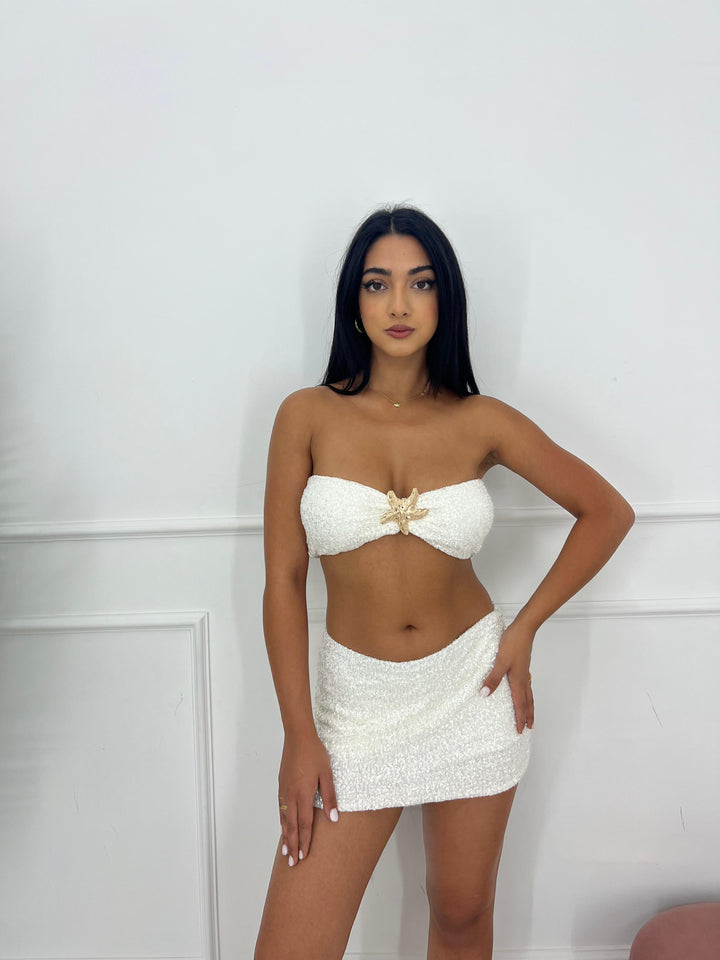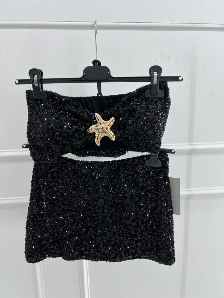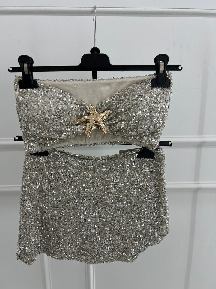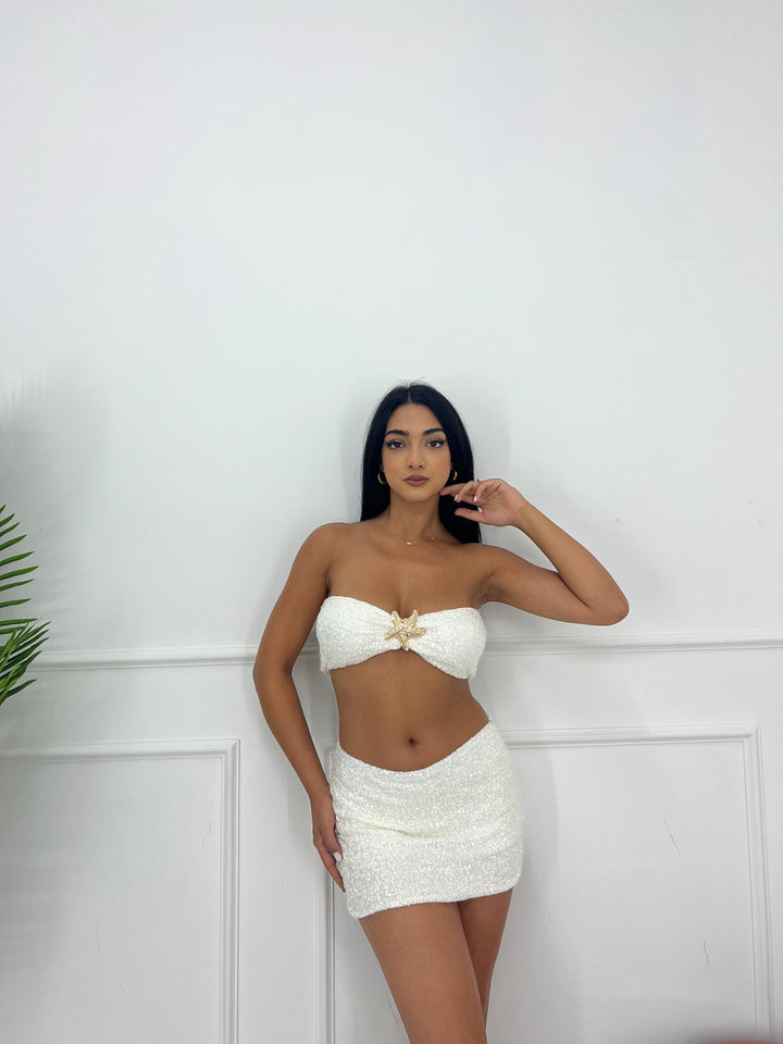 COORDINATO CON PANTALONCINO FODERTO E TOP CROP CON STELLA MARINA ORO COME DETTAGLIO